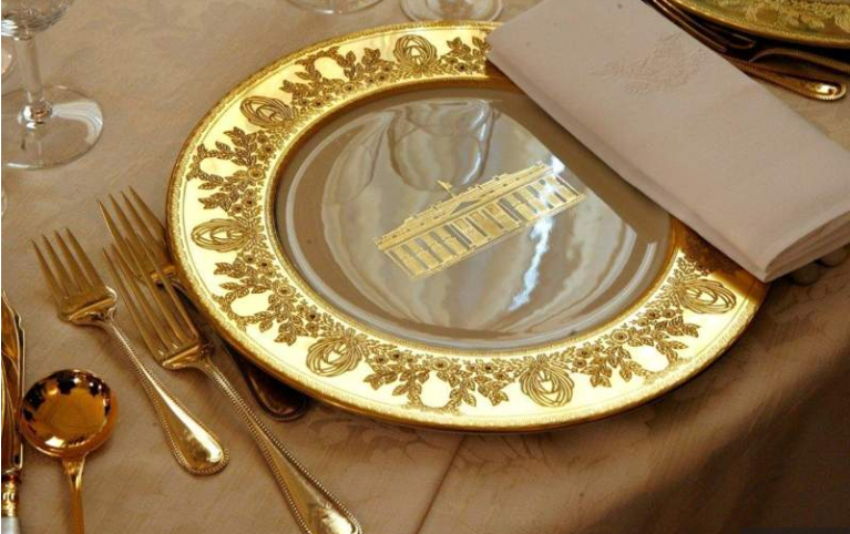 Среди сувениров – коллекция фарфора, покрытая 22-кратным золотом и платиной, на которой изображены инициалы Гарри и Меган, орнамент из золотых корон и национальных символов Соединенного Королевства – английской розы, шотландского чертополоха, ирландского трилистника и валлийского нарцисса.