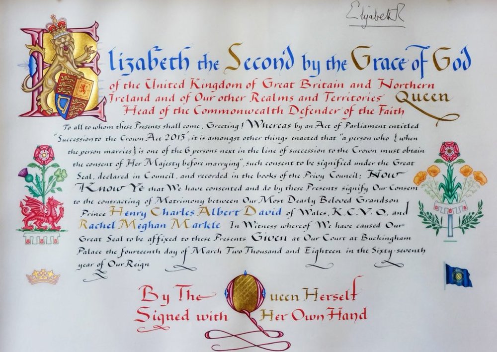 В Сети позже появилось фото письменного разрешения на брак принца, подписанное самой королевой.