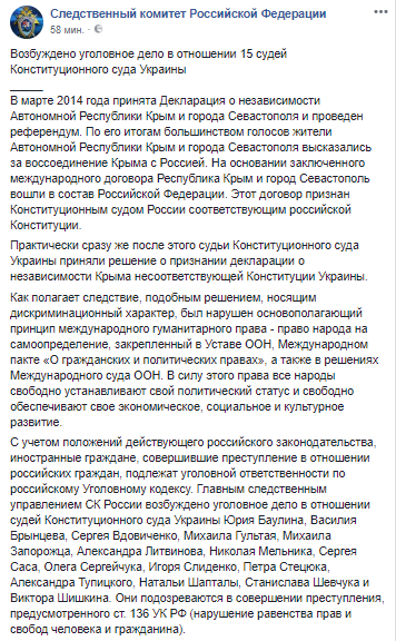 Дело возбуждено в отношении судей Юрия Баулина, Василия Брынцева, Сергея Вдовиченко, Михаила Гультая, Михаила Запорожца, Александра Литвинова, Николая Мельника, Сергея Саса, Олега Сергейчука, Игоря Слиденко, Петра Стецюка, Александра Тупицкого, Натальи Шапталы, Станислава Шевчука и Виктора Шишкина. Они подозреваются в совершении преступления, предусмотренного ст. 136 УК РФ (нарушение равенства прав и свобод человека и гражданина).