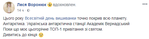 "В этом году Всемирный день вышиванки точно покрыл всю планету. Антарктика. Украинская антарктическая станции "Академик Вернадский". Пока мое нынешнее ТОП-1 поздравления с праздником. Смотреть до конца", - написала она.
