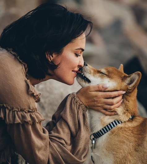 На свежих фотографиях в Instagram Даша предстает в нежном образе в легком платьице цвета кофе с молоком с собакой породы акита ину.