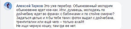 "Обыкновенный молодняк обыкновенно едет кое-как. Или, думаешь, молодежь по дойчебану едет во фраках с бабочками и по стойке смирно? Задаться целью и я бы тебе таких фоток выдал с дойчебана, трентиталии или ещё чего - только ахай!!", -написал  пользователй Алексей Тарков.