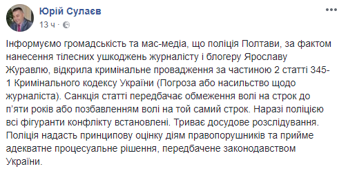 Полиция Полтавы по факту нанесения телесных повреждений журналисту открыла уголовное производство. Санкция статьи предусматривает ограничение свободы на срок до пяти лет или лишение свободы на тот же срок.