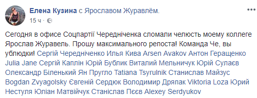 Она сообщила, что происшествие случилось в в офисе одной из партий, куда Журавель пришел узнать почему последнему со стороны политсилы угрожали в комментариях соцсетей.