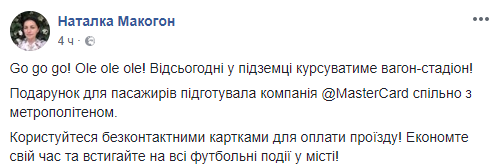"Go go go! Ole ole ole! С сегодняшнего дня в подземке будет курсировать вагон-стадион!" - сказано в сообщении.