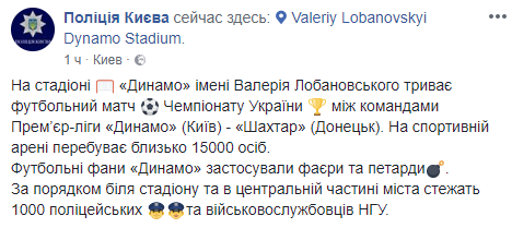 По данным полиции Киева, на стадионе имени Валерия Лобановского в Киеве находилось около  тысяч болельщиков. Порядок обеспечивали 1000 полицейский и нацгвардейцев.