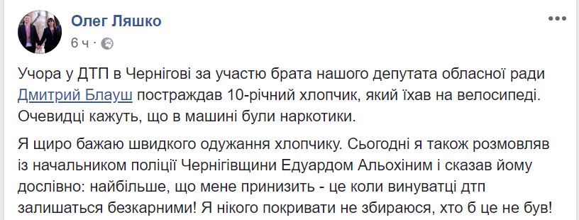 "Вчера в ДТП в Чернигове с участием брата нашего депутата областного совета Дмитрия Блауш пострадал 10-летний мальчик, который ехал на велосипеде. Очевидцы говорят, что в машине были наркотики", - написал Ляшко.