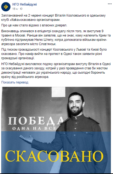 Организаторы одесского клуба "Itaka" отменили концерт Виталия Козловского, запланированный на 2 июня после того, как певец выступил в Москве на 9 мая.
