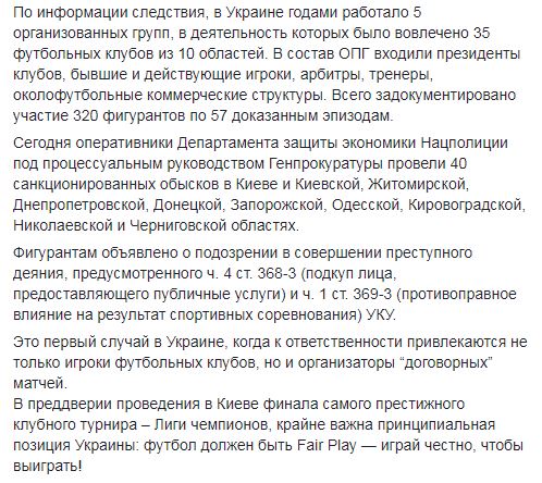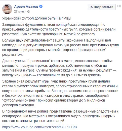 "Для получения "правильного" счета в матче, использовались любые методы: от подкупа игроков, арбитров, собственников клубов до запугивания и угроз. Суммы "вознаграждения" за нужный результат — победу или ничью — составляли от 30 до 100 тысяч гривен. Заранее зная результат игры, участники преступных групп делали ставки в букмекерских конторах, зарегистрированных в странах Азии и получали огромные прибыли. Благодаря анонимности, непрозрачности и бесконтрольности тотализаторов в этих странах, своеобразный “футбольный бизнес” приносил организаторам до 5 миллионов долларов ежегодно", - написал Аваков.