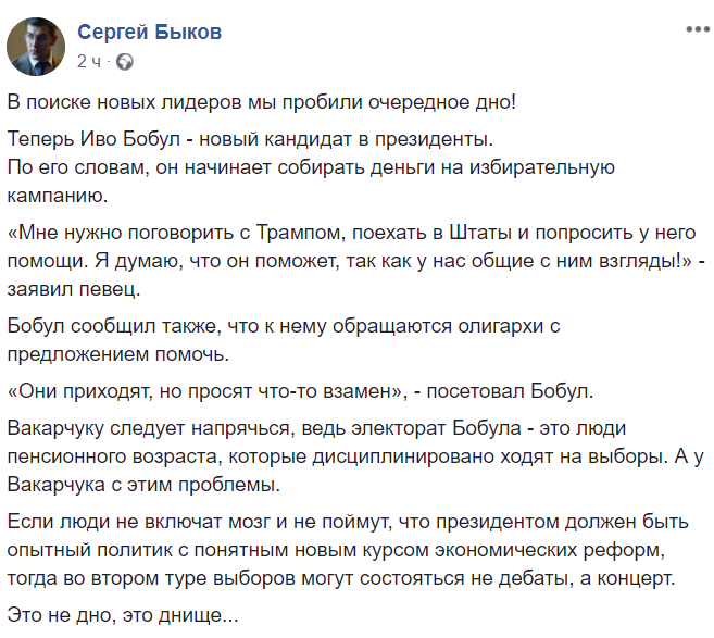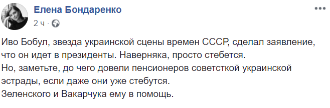 "Иво Бобул, звезда украинской сцены времен СССР, сделал заявление, что он идет в президенты. Наверняка, просто стебется. Но, заметьте, до чего довели пенсионеров советсткой украинской эстрады, если даже они уже стебутся".