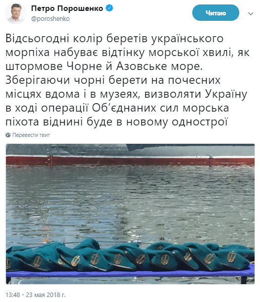 "Исходя из нашего собственного исторического календаря, принял решение установить новый День морской пехоты Украины, который отныне будет отмечаться на государственном уровне 23 мая. Подписал соответствующий указ", - сообщил Порошенко.