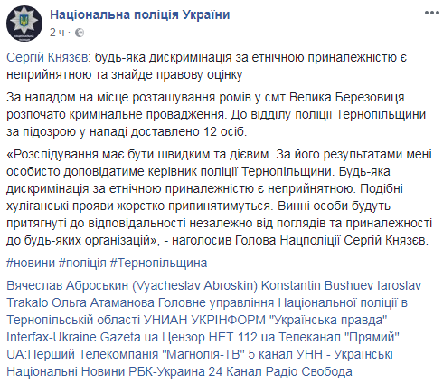 Глава Национальной полиции Сергей Князев подчеркнул недопустимость дискриминации по этнической принадлежности.
