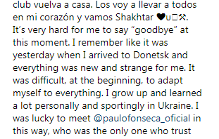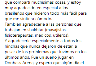 Наконец, хочу сказать спасибо всем болельщикам, потому что вы всегда поддерживали нас независимо от того, в какой сложной ситуации мы жили. Сыграть на "Донбасс-Арене" было для меня мечтой и я надеюсь, что "Шахтер" однажды вернется домой", – написал он у себя в Instagram.