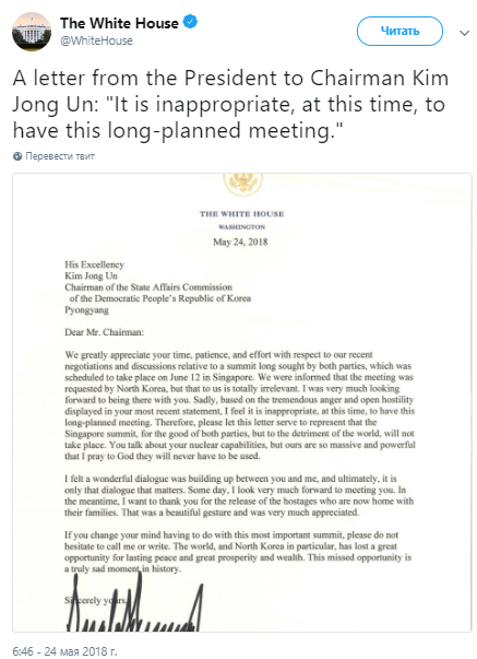 Президент США Дональд Трамп объявил об отказе от встречи с лидером КНДР Ким Чен Ыном,  которая, по предварительным данным, должна была состояться в Сингапуре 12 июня. Об этом стало известно из письма главы Белого дома, которое было опубликовано американской администрацией в Twitter.