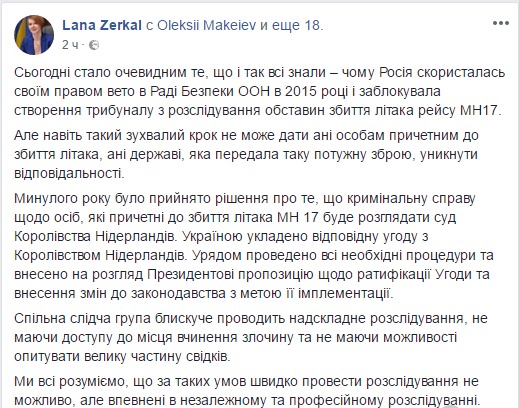 "Сегодня стало очевидным, что и так все знали – почему Россия воспользовалась своим правом вето в Совете безопасности ООН в 2015 году и заблокировала создание трибунала по расследованию обстоятельств катастрофы самолета рейса MH17. Но даже такой дерзкий шаг не может дать ни лицам, причастным к сбиванию самолета, ни государству, которое передало такое мощное оружие, уйти от ответственности", - написала Зеркаль на своей странице в соцсети Facebook  в четверг.