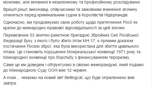 "Перевозка 53-й зенитно-ракетной бригадой Вооруженных сил Российской Федерации "Бук", с которого и был сбит самолет МН 17, является прямым доказательством поставки Россией оружия, которое было использовано для сбивания гражданского самолета. Это является нарушением Монреальской конвенцией 1971 года и Международной конвенции о борьбе с финансированием терроризма. Именно это мы докажем и обоснуем в своем меморандуме, который представим в Международный суд ООН уже 12 июня", - написала она.