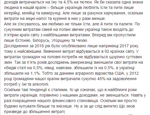 "Наши соседи поляки тратят на питание 16,5% и 6,2% пропивают. Китайцы проедают 22,5% и еще 2,3% платят за пагубные привычки. В Египте, к которому многие украинцы ездят отдыхать, 36,7% доходов тратится на еду и 4,5% на табак. Как сказал бы один известный человек в нашей стране – больше украинцев любят есть и пить только нигерийцы, кенийцы и камерунцы. Но только за счет питания, поскольку затраты на горячительные напитки и курение в них в разы меньше", - подчеркивает он.