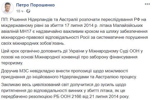 Призываю весь цивилизованный мир присоединиться к усилиям по привлечению к ответственности виновных в сбивании самолета, как это предусмотрено резолюцией СБ ООН 2166 от 21 июля 2014 года", – написал в Facebook президент Петр Порошенко.
