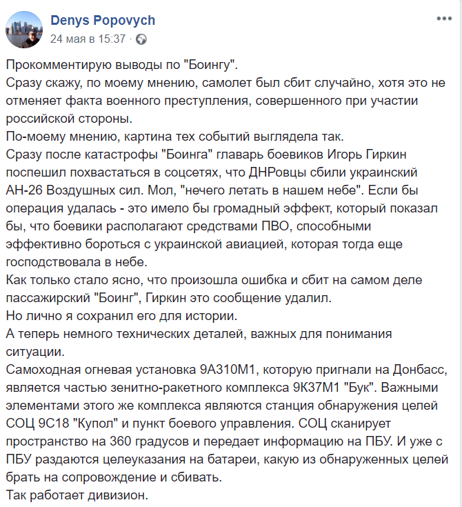 Украинский журналист Денис Попович, который специализируется на военной аналитике, заявил, что, судя по результатам следствия, сепаратисты сбили "Боинг" непреднамеренно.