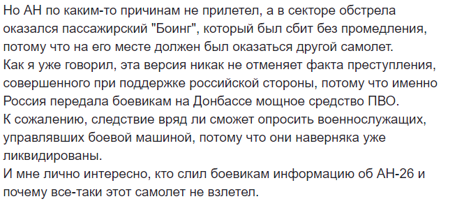 Якобы еще когда не было известно, что разбился именно пассажирский лайнер, тогдашний "министр обороны ДНР" Игорь Гиркин (Стрелков) написал в интернете, что сбили украинский военный АН-26.