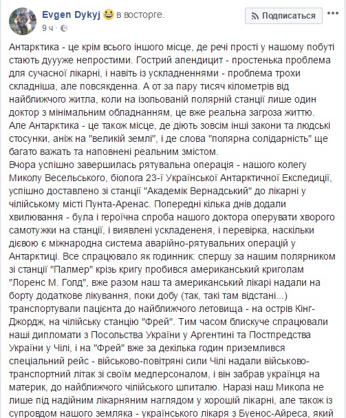Украинского полярника и биолога Николая Весельского эвакуировали с украинской антарктической станции "Академик Вернадский" из-за острого аппендицита. Его увезли в больницу в чилийском городе Пунта-Аренас. Об этом глава Национального антарктического научного центра Евгений Дикий написал на странице в Facebook.