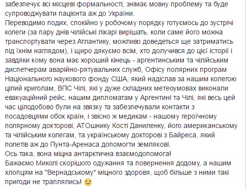 "Все сработало как часы: сначала за нашим полярником со станции "Палмер" сквозь лед пробился американский ледокол "Лоренс М. Голд", уже вместе наш и американский врачи оказали на борту дополнительное лечение, пока сутки транспортировали пациента до ближайшее аэропорта - на остров Кинг -Джордж, на чилийскую станцию ​​"Фрей", - написал глава научного антарктического центра.