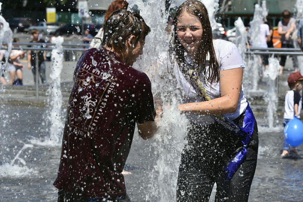 Выпускники, которые закончили 11 класс, по негласной традиции после школьной линейки идут нарядные в центр города и купаются в фонтанах, фото: Аркадий Манн, "Страна"