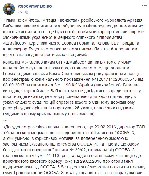 Журналист  Владимир Бойко выдвинул версию, что обвинения Бориса Германа в убийстве российского журналиста Аркадия Бабченко - это был способ решить корпоративный спор между учредителями украинского-германского совместного предприятия "Шмайсер".