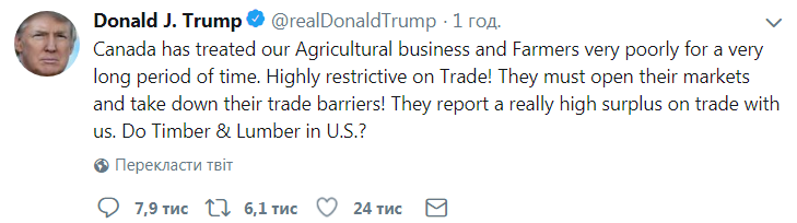 "Канада плохо относилась к нашему сельскохозяйственному бизнесу и фермерам на протяжении долгого времени. Особые ограничения касались торговли. Они должны открыть свои рынки и отменить торговые барьеры", - написал президент США в Twitter.