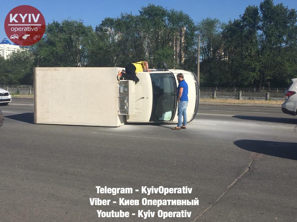 В Киеве на Броварском проспекте, возле АЗС KLO, перевернулся грузовик Volkswagen.