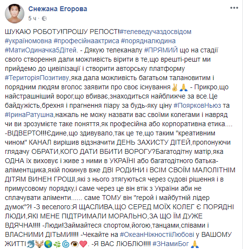 "Ищу работу! Прошу! Репост! Спасибо телеканалу "Прямий", за то, что на стадии своего создания дали возможность верить в то, что в конце концов мы придем к цивилизации и создать авторскую платформу "Территория Позитива", которая дала многим талантливым и порядочным людям вслух заявить о своем существовании. Обидно, что самый страшный враг, который убивает, находится ближе всего", - написала Снежана Егорова.