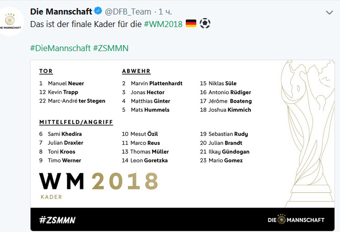 Изменения в составе возможны только в случае травмы игрока и не позднее, чем за 24 часа до первого матча. На чемпионате мира сборная Германии выступит в группе F, в которой сыграет с командами Мексики (17 июня, Москва, "Лужники"), Швеции (23 июня, Сочи) и Южной Кореи (27 июня, Казань).