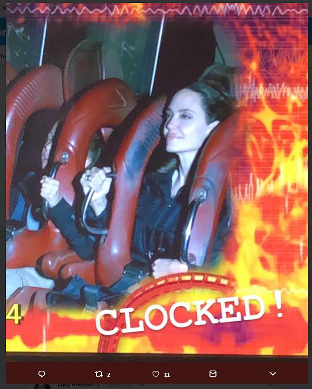Изображение улыбающейся Джоли на американских горках появилось на огромных табло, установленных в парке. На экранах обычно показывают всех посетителей аттракциона. Снимок быстро распространился в соцсетях.