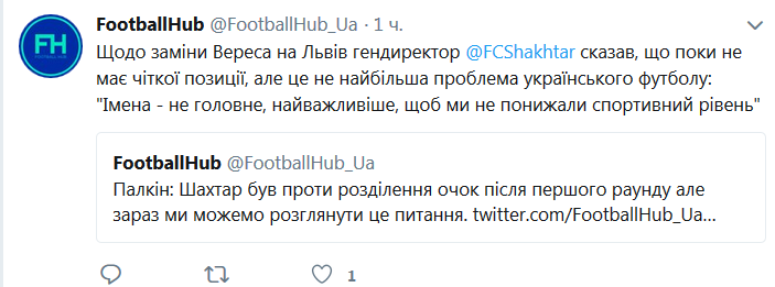 Как передает портал FootballHub в своем Twitter генеральный директор Шахтера Сергей Палкин заявил, что клуб готов рассмотреть изменения в регламенте УПЛ на следующий сезон, касающиеся набранных очков на первом этапе чемпионата.