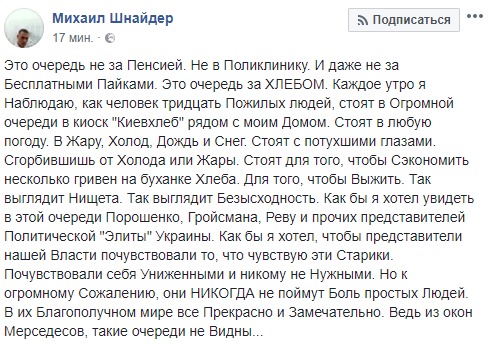 "Стоят в любую погоду. В Жару, Холод, Дождь и Снег. Стоят с потухшими глазами. Сгорбившись от Холода или Жары. Стоят для того, чтобы Сэкономить несколько гривен на буханке Хлеба. Для того, чтобы Выжить. Так выглядит Нищета. Так выглядит Безысходность. Как бы я хотел увидеть в этой очереди Порошенко, Гройсмана, Реву и прочих представителей Политической "Элиты" Украины. Как бы я хотел, чтобы представители нашей Власти почувствовали то, что чувствую эти Старики. Почувствовали себя Униженными и никому не Нужными. Но к огромному Сожалению, они НИКОГДА не поймут Боль простых Людей. В их Благополучном мире все Прекрасно и Замечательно. Ведь из окон Мерседесов, такие очереди не Видны...", - написал он.