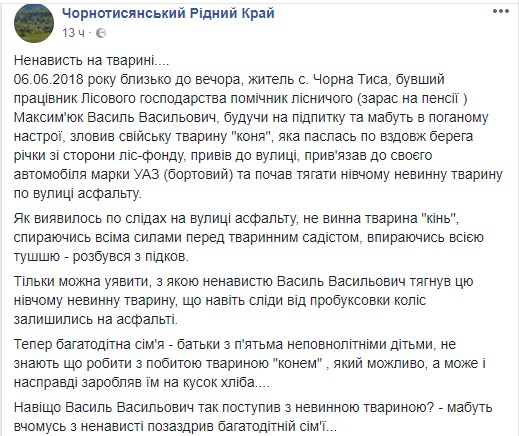 Вечером 6 июня в селе Черная Тиса на Закарпатье было совершено жестокое насилие над животным: мужчина привязал коня к автомобилю и протащил его по дороге.