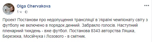 "Проект постановления о недопущении трансляции в Украине чемпионата мира по футболу не включен в повестку дня. Не хватило голосов. Следующая пленарная неделя – уже футбол. Постановление 8343 авторства Ляшко, Березюка, Мосийчука и Лозового – на помойку", - написала народный депутат из фракции "Блок Петра Порошенко" Ольга Червакова на своей странице в соцсети Facebook.