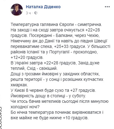 В Киеве 8 июня будет сухо и +27 градусов. Вероятность дождя в столице - в субботу. Потому ночная температура начинает выравниваться и уже почти не будет ниже 10 градусов", - написала она.