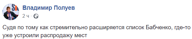 "Судя по тому как стремительно расширяется список Бабченко, где-то уже устроили распродажу мест", - пишет журналист Владимир Полуев.