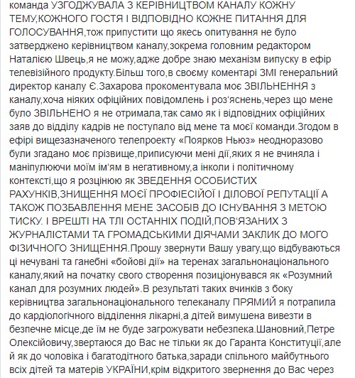 "Обращаюсь к Вам, уважаемый господин Президент, как к лидеру Революции Достоинства с просьбой разобраться и дать свою оценку  действиям, которые совершенно безнаказанно разворачиваются на общенациональном телевизионном канале ПРЯМОЙ", - написала она.