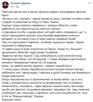 "Часть из них и сегодня, и завтра принесут дожди с грозами и даже ливни с градом и шквалами на Запад и Север Украины. Сегодня осадки пройдут преимущественно в западных областях, а уже ближайшей ночью приблизятся к северной части. А Государственная служба по чрезвычайным ситуациям даже предупредила, что "в горах угроза образования селей". Поэтому кто отдыхает в Карпатах, особенно путешествует горами - будьте внимательными и осторожными", - написала она.