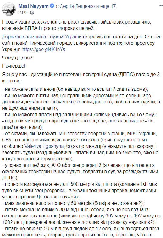 "Если бы Государственная авиационная служба Украины писала правила использования ноутбуков, то уверен, что на них нельзя было бы писать тексты, в которых говорится о коррупции", - иронизирует над правилами волонтер Маси Найем.
