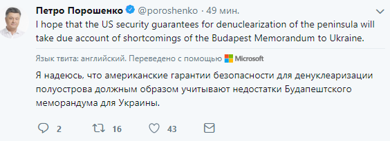 "Надеюсь, что гарантии безопасности со стороны США в связи с денуклеаризацией полуострова учтут недостатки Будапештского меморандума относительно гарантий безопасности Украины", - добавил Порошенко.