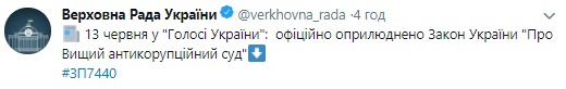 "13 июня в "Голосе Украины": официально обнародован закон Украины "О Высшем антикоррупционном суде", - сообщается в микроблоге Верховной Рады в соцсети Twitter во вторник вечером.