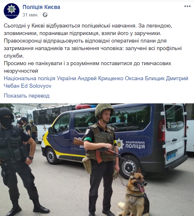 "Сегодня в Киеве проходят полицейские учения. По легенде, злоумышленники, ранив предпринимателя, взяли его в заложники. Правоохранители отрабатывают соответствующие оперативные планы для задержания нападавших и освобождения мужчины: вовлечены все профильные службы. Просим не паниковать и с пониманием отнестись к временным неудобствам", - говорится в сообщении правоохранителей.