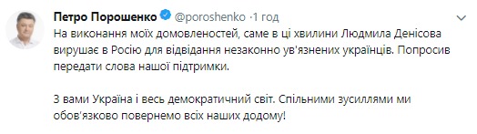 "Во исполнение моих договоренностей, именно в эти минуты Людмила Денисова отправляется в Россию для посещения незаконно заключенных украинцев. Попросил передать слова нашей поддержки", - написал глава государства в twitter.