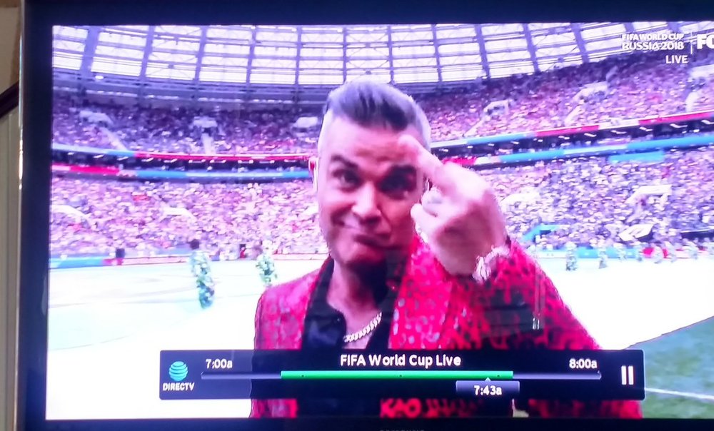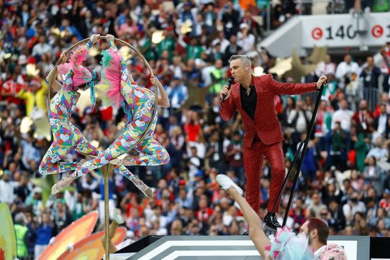 17:30  Открытие началось! Робби Уильямс поет свой суперхит Feel. Потом - Let Me Entertain You.
