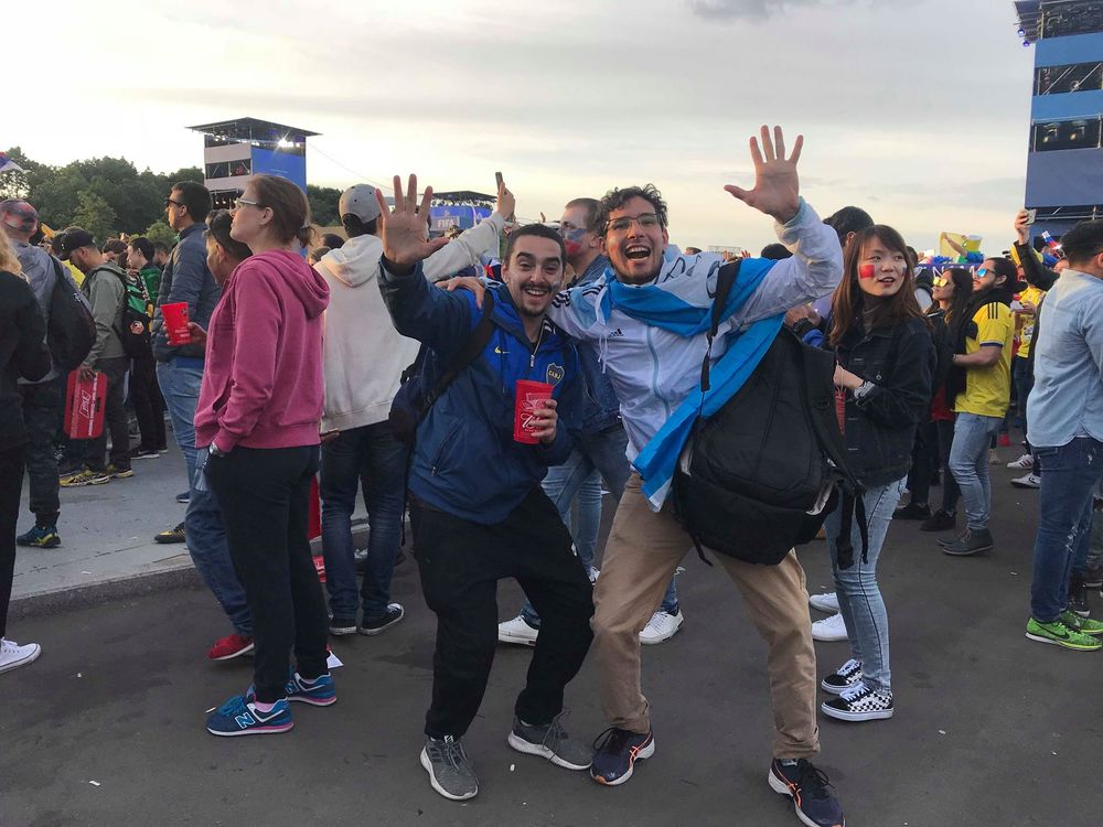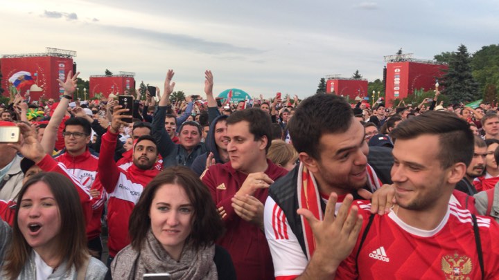 19:33  В толпе много испанской речи. В ЧМ участвуют много сборных из стран Латинской Америкии - поэтому группа поддержки внушительная. Они подбегают к русским, хлопают их по плечам и кричат Russia!