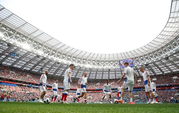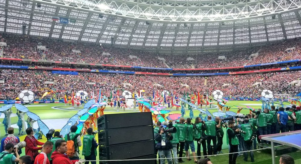 17:47  Начали разбирать сцену на поле. Готовятся к стартовому поединку России с Саудовской Аравии.