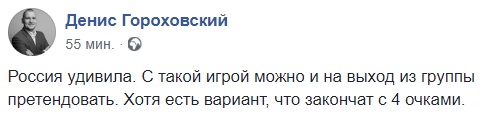 20:45  "Россия удивила. С такой игрой можно и на выход из группы претендовать. Хотя есть вариант, что закончат с 4 очками", - пишет блогер Денис Гороховский.
